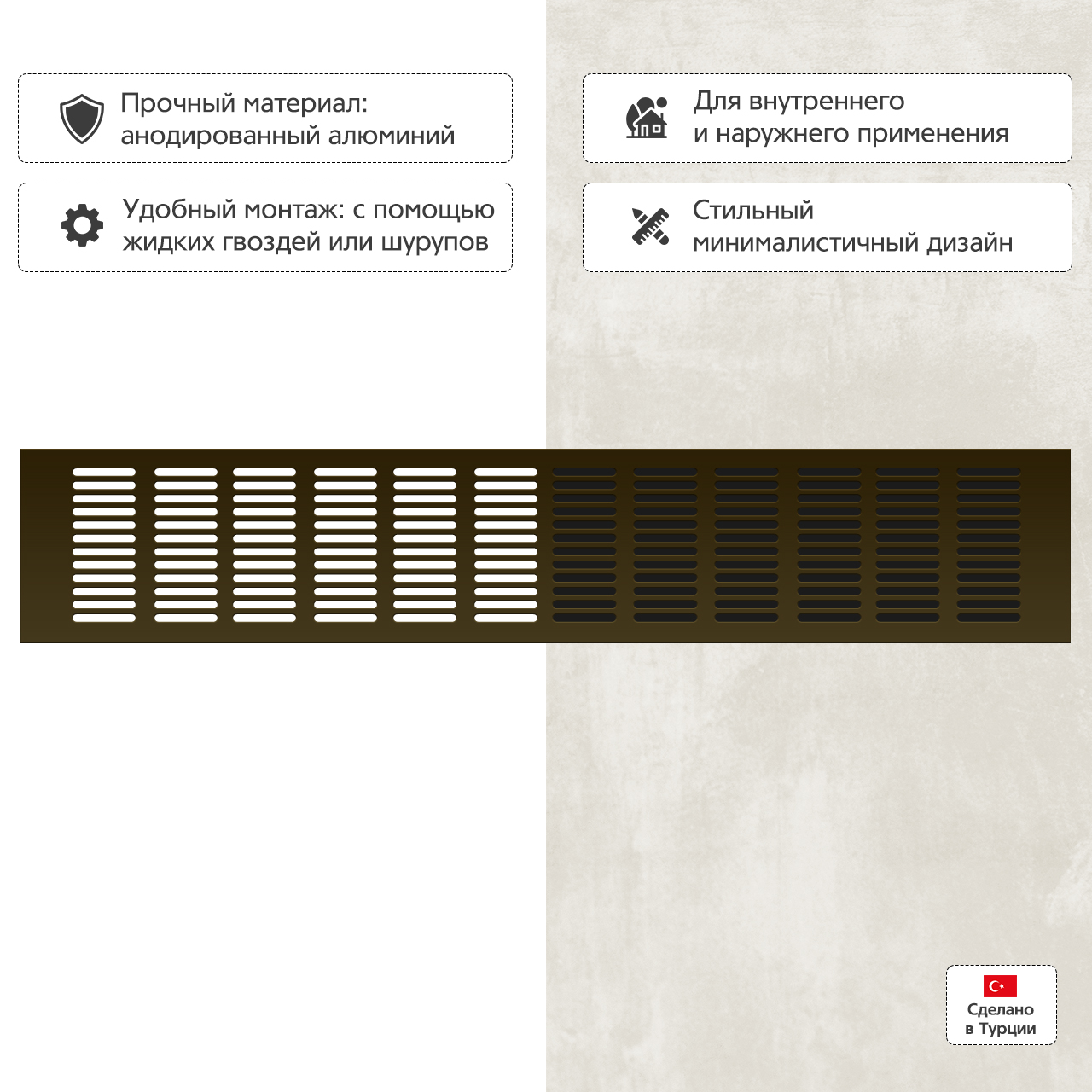 Прямоугольная вентиляционная решетка изготовлена из анодированного алюминия.